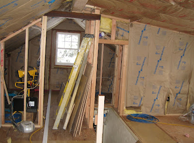 This is the upstairs half story as it was when we bought the place. It was a seasonal space, perhaps used as a workshop or for storage. In Phase II of our remodel, we put in a large shed dormer (shed dormers are flat so allow more head room than a gabled dormer), transforming this space entirely. What you're looking at is the east side of the house.